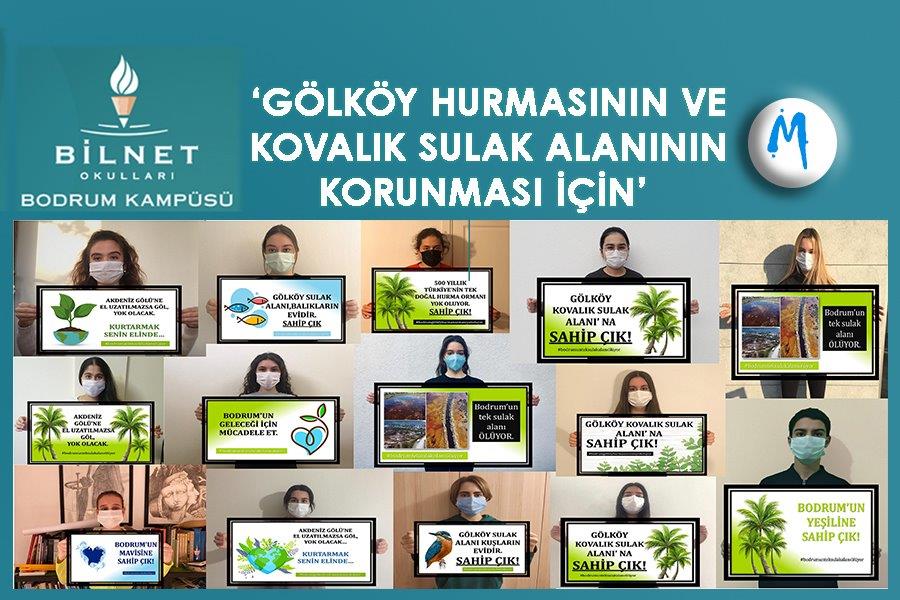 Öğrencilerin evlerinden çıkamamaları çevre için çalışmalarına engel olmadı Doğasever Bilnetli öğrenciler, ilk etapta konuyla ilgili bilinçlendirme çalışmaları yaparak hazırladıkları afişler ve bilgilendirme metinleriyle arkadaşlarını ve öğretmenlerini bilgilendirdiler. Sulak alanın yaşaması için çalışan Bodrum Kent Konseyi ile online pek çok toplantı gerçekleştiren öğrenciler, hazırladıkları kamu spotlarını sosyal medyada paylaşmaya başladılar. Bütün bunların yanında daha önce yapılan Gölköy kampanyalarına katılan Fotoğrafçı Mustafa Ünlü ile bölgenin tarihi, jeolojik yapısı ve hurma ağaçları ile ilgili bir toplantı yapan öğrenciler, Bodrum Kent Konseyinin başlattığı online imza kampanyasına da destek sağlamaya çalışıyorlar.