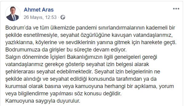 Hemen ardından Bodrum Belediye Başkanı Ahmet Aras, kendi sosyal medya hesabından bu söylemin kendine ait olmadığını belirten bu açıklamayla konuya açıklık getirdi.