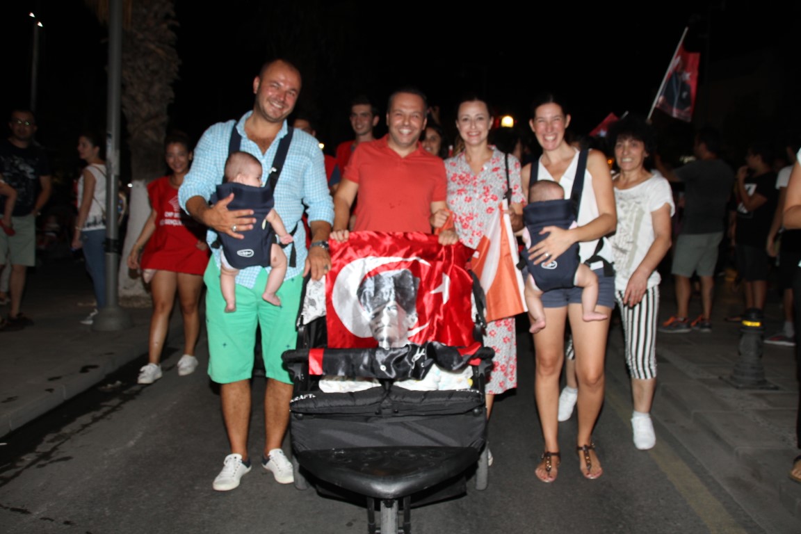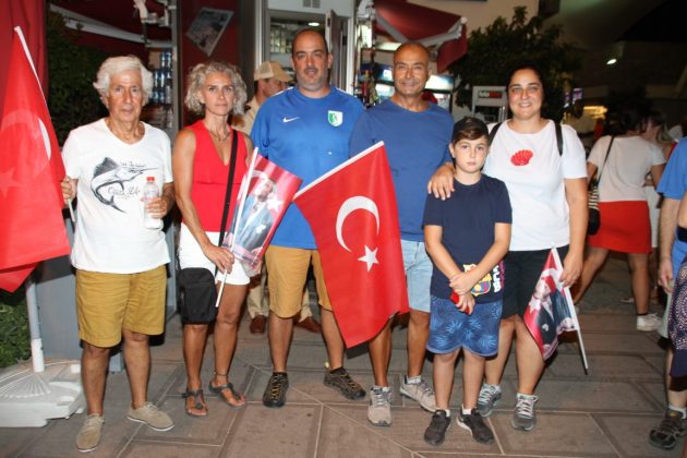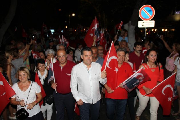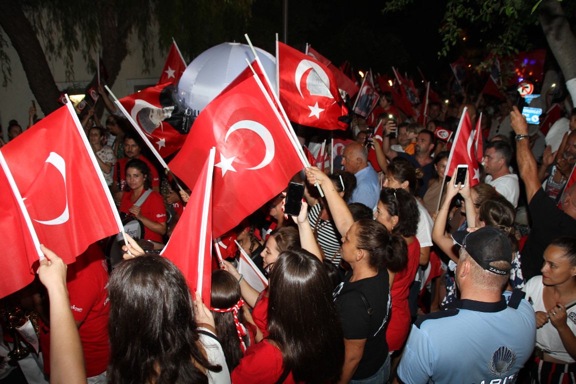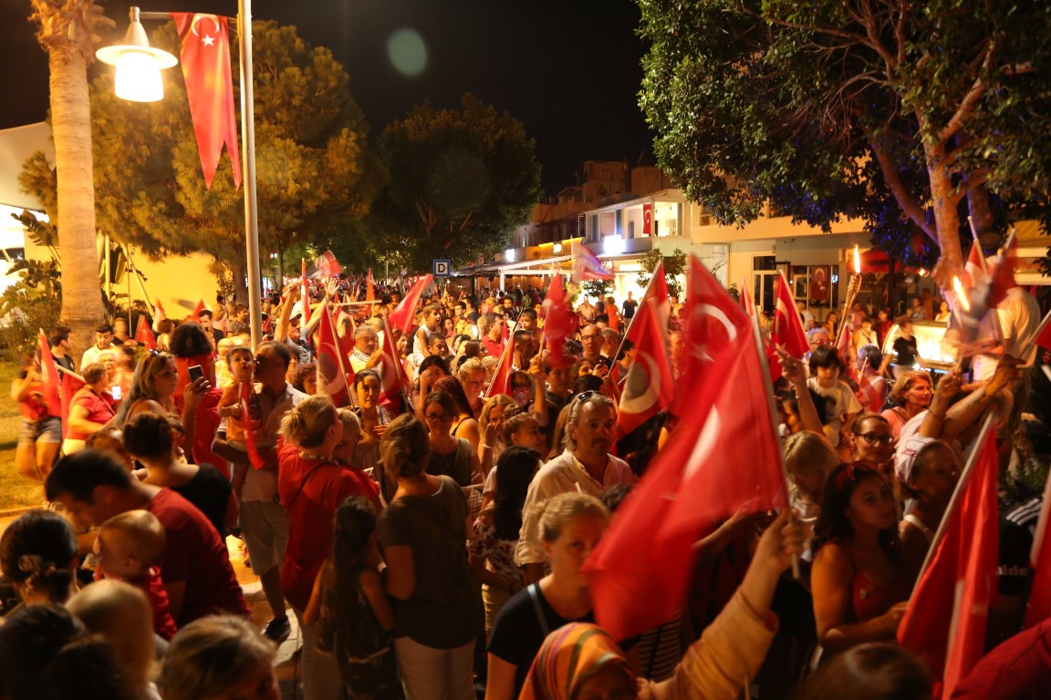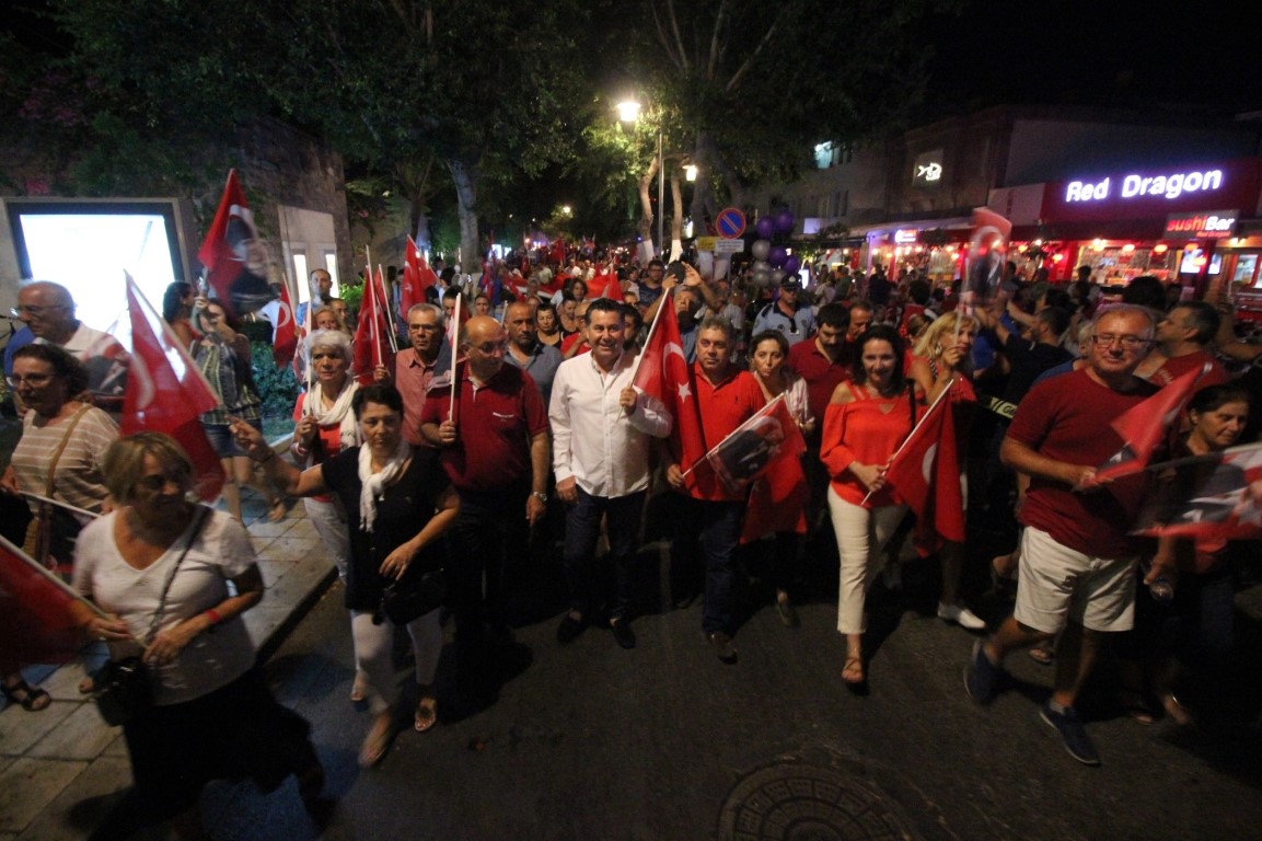 Neyzen Tevfik Caddesi boyunca ellerinde meşaleler, Türk Bayrakları ile marşlar eşliğinde yürüyen vatandaşlara mekanlarda bulunanlar da alkışlarla destek verdi.