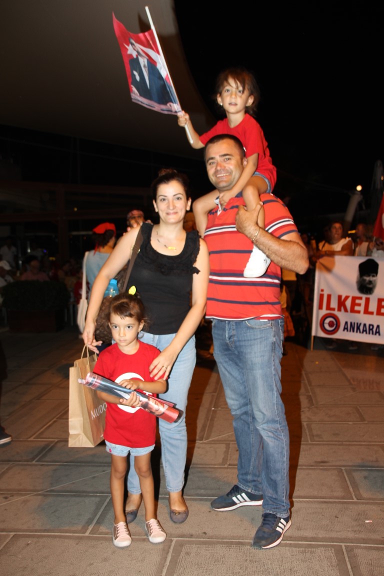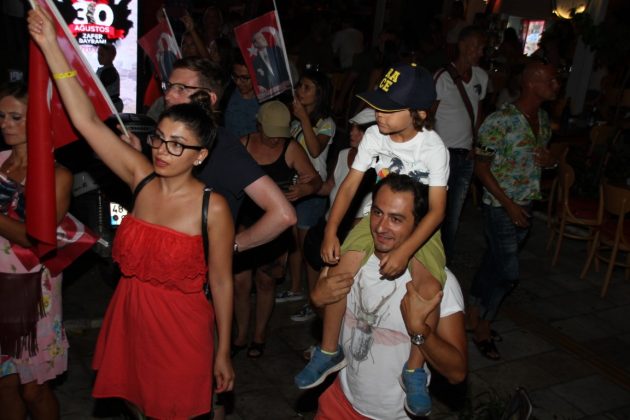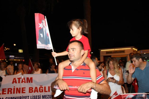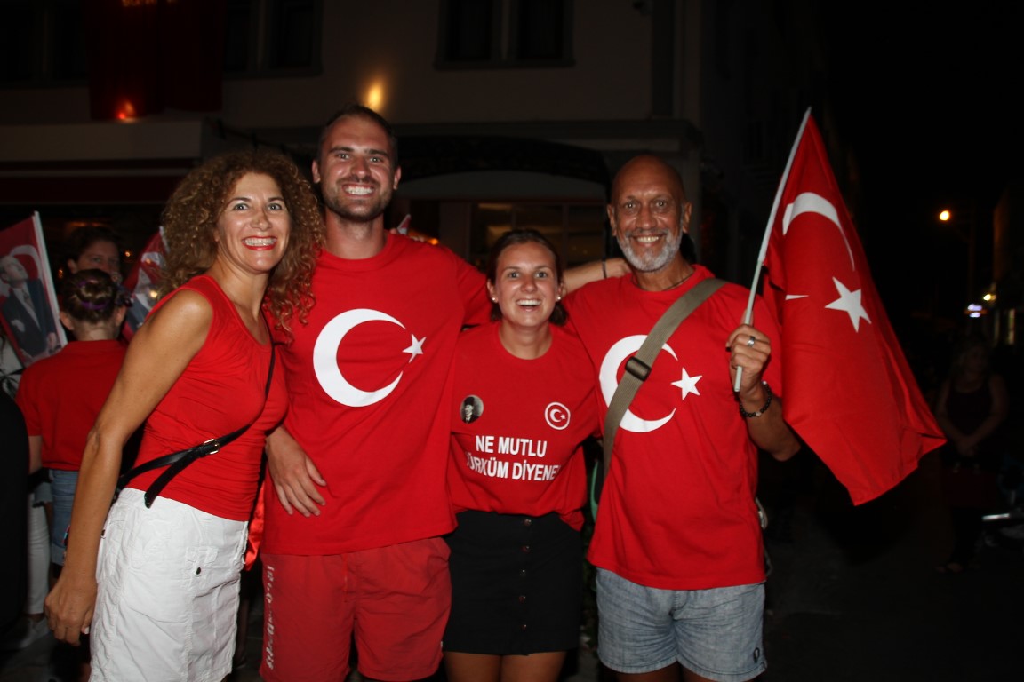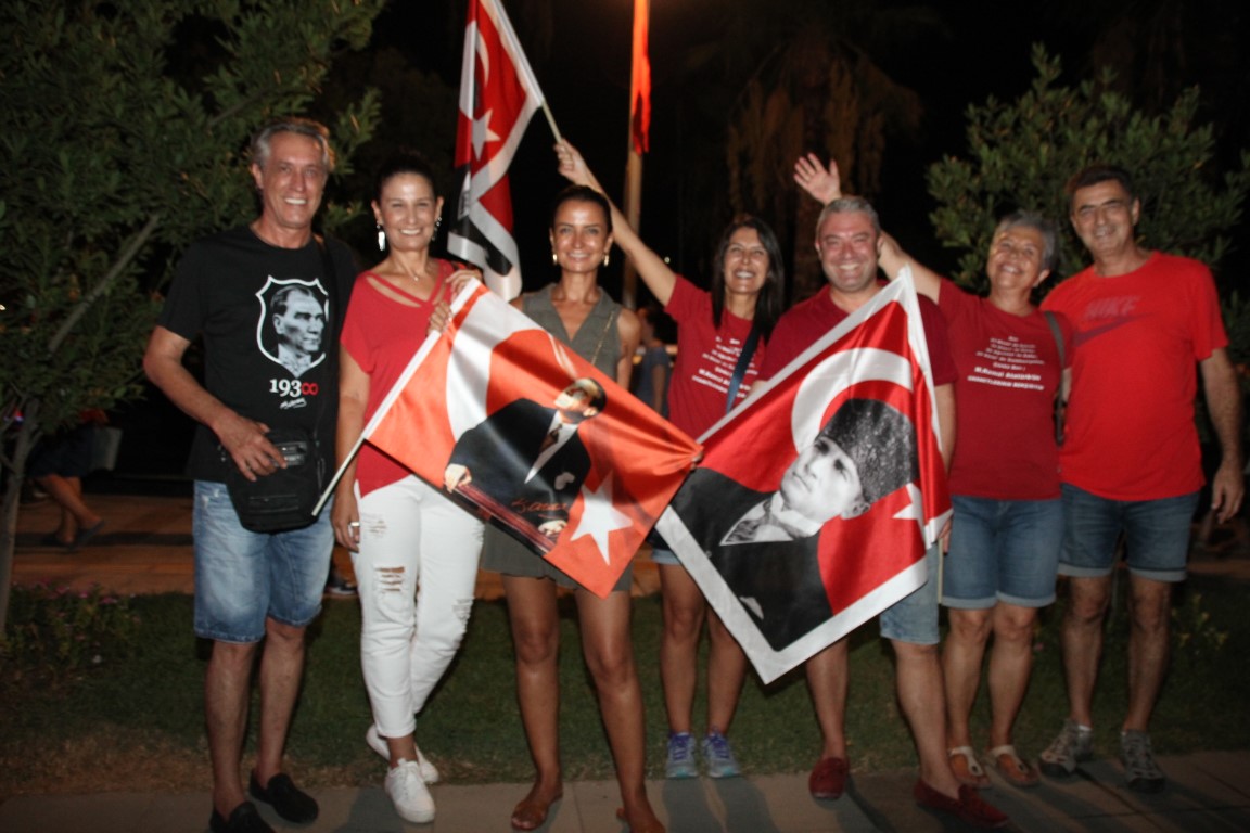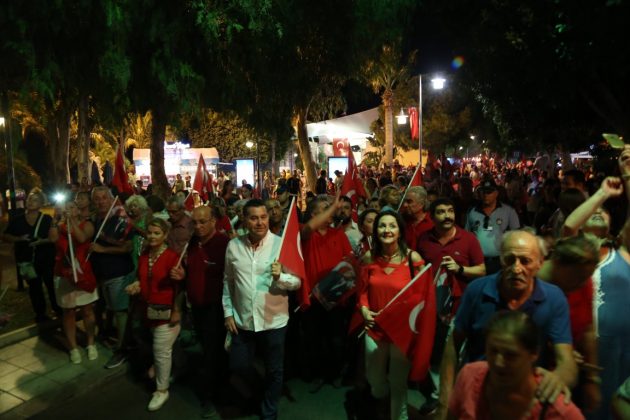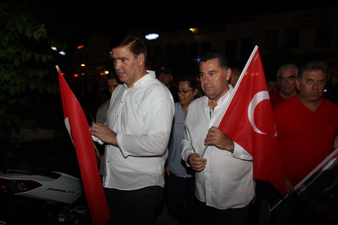 Neyzen Tevfik Caddesi boyunca ellerinde meşaleler, Türk Bayrakları ile marşlar eşliğinde yürüyen vatandaşlara mekanlarda bulunanlar da alkışlarla destek verdi.