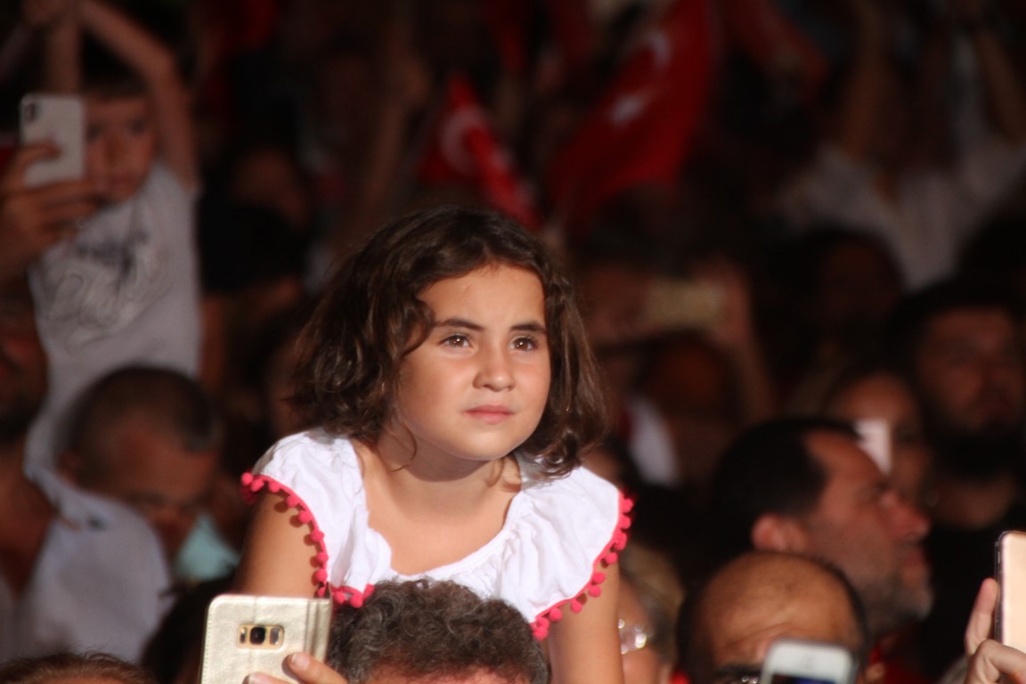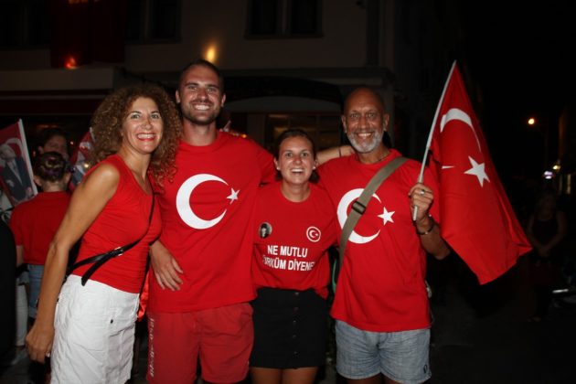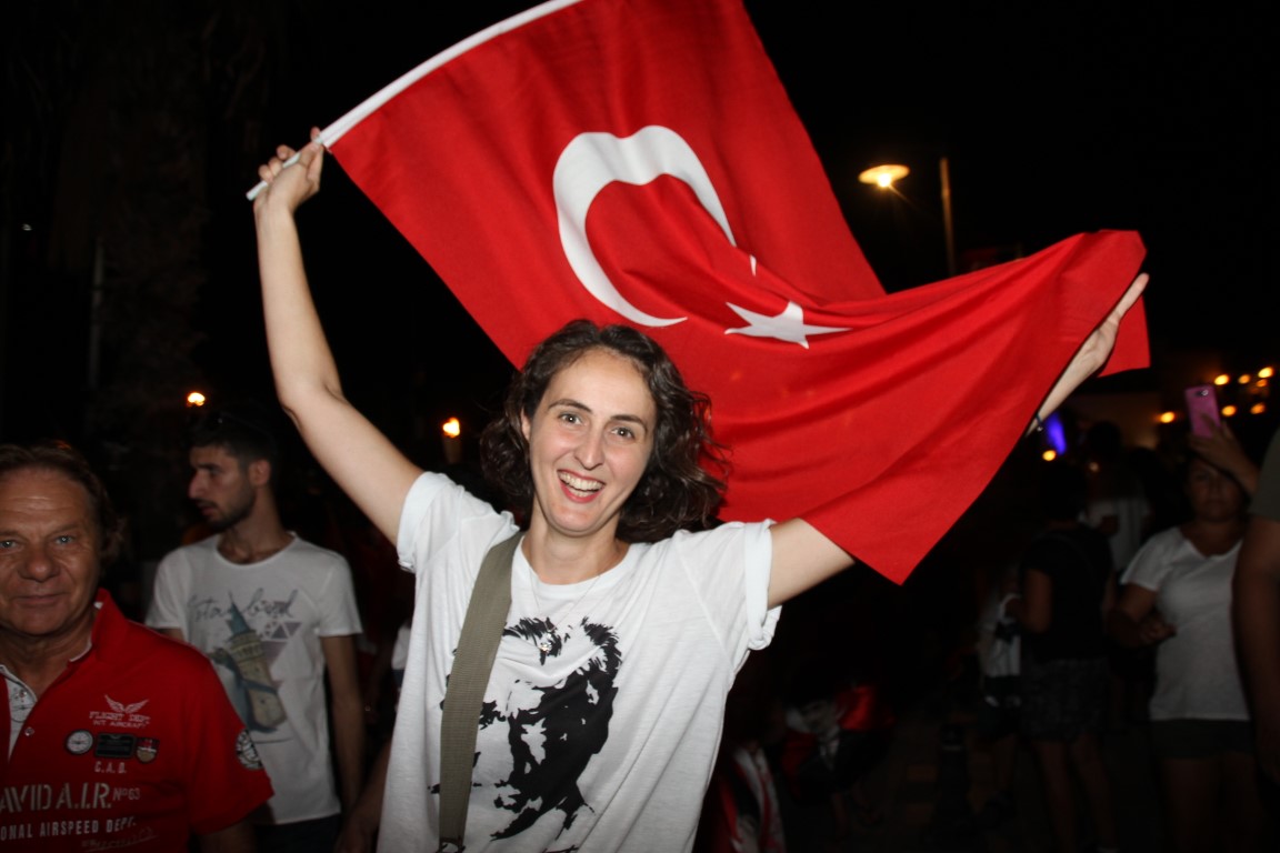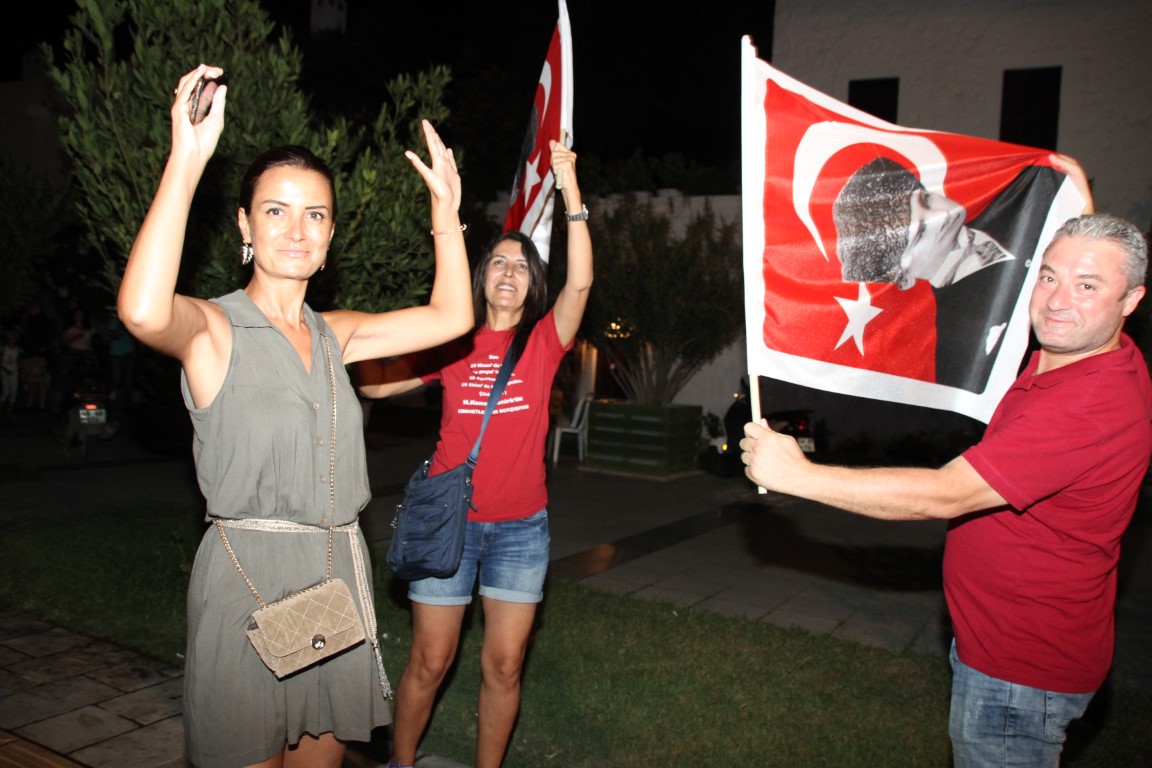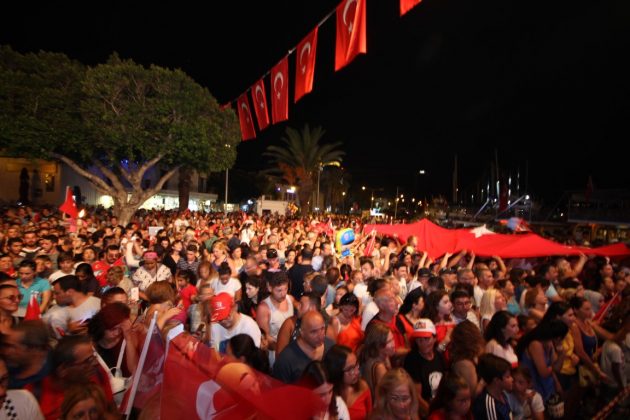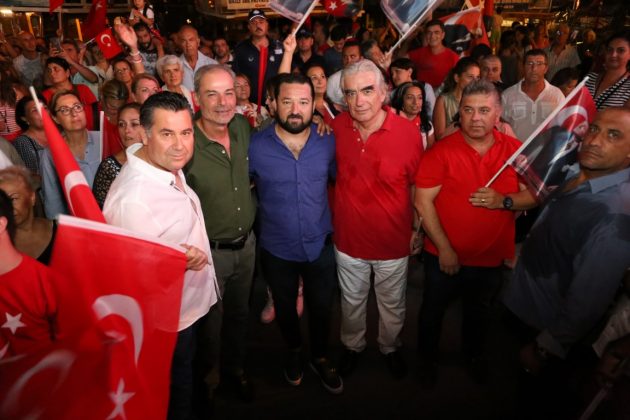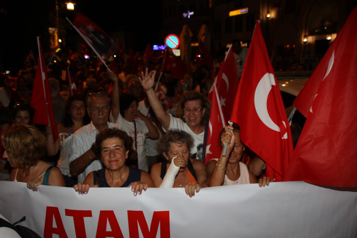 Neyzen Tevfik Caddesi boyunca ellerinde meşaleler, Türk Bayrakları ile marşlar eşliğinde yürüyen vatandaşlara mekanlarda bulunanlar da alkışlarla destek verdi.