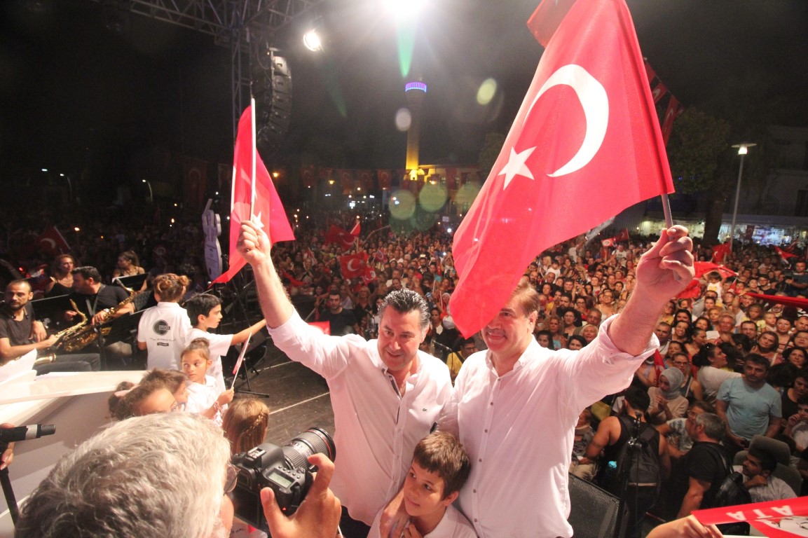 Bodrum Belediye Meydanı’nda sona eren fener alayının ardından düzenlenen Midtown Orkestrası konseri öncesinde vatandaşlara seslenen Bodrum Kaymakamı Bekir Yılmaz “Sevgili Bodrumlu kardeşlerim, öncelikle sevgiyle saygıyla selamlıyorum Zafer Bayramınızı en içten duygularla kutluyorum. Sevgili Bodrumlular biliyorsunuz bizim milletimizin tarihi şan ve şerefle dolu bir tarih. İşte o şan ve şerefle dolu zaferlerin biri de 30 Ağustos. Bugün gururluyuz. Bu güzel bayramı Bodrum’da gerçekten coşkuyla kutluyoruz. Hepinize teşekkür ediyorum. Belki de Türkiye’de bu bayramı böyle coşkuyla kutlayan bizim gibi çok az yer var. Hepinizi kutluyorum, tebrik ediyorum. İnşallah nice nice güzel günlerde böyle coşkulu bayramlarda birlikte olmak dileğiyle. Cumhuriyetimizin kurucusu büyük önder Atatürk’ü, silah arkadaşlarını, aziz gazilerimizi, şehitlerimizi rahmetle anıyorum, hepinize sevgi ve saygılarımı sunuyorum.” dedi.