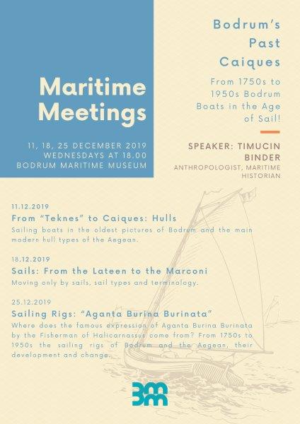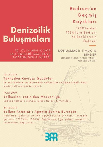 Denizcilik Buluşmaları’nın Aralık ayı programı Antropolog ve Tarih Araştırmacısı Timuçin Binder’in konuşmacı olarak katılımıyla çift dilli olarak gerçekleşecek. “Bodrum’un Geçmiş Kayıkları: 1750’lerden 1950’lere Bodrum Yelkenlilerinin Öyküsü” ana başlığının İngilizce ve Türkçe toplam 6 oturum halinde sunulacağı programın Türkçe sunumları 10, 17, 24 Aralık 2019, Salı günleri saat 18:00’da; İngilizce sunumları ise 11, 18, 25 Aralık Çarşamba günleri yine 18.00’da müzede gerçekleşecek.