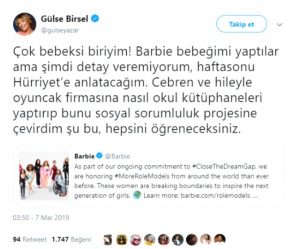 Konuya dair kişisel Twitter hesabı üzerinden bir açıklama yapan Birsel, “Çok bebeksi biriyim! Barbie bebeğimi yaptılar ama şimdi detay veremiyorum, ifadesini kullandı. Birsel şöyle devam etti: “Cebren ve hileyle oyuncak firmasına nasıl okul kütüphaneleri yaptırıp bunu sosyal sorumluluk projesine çevirdim şu bu, hepsini öğreneceksiniz.”