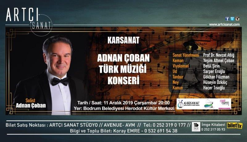 ‘Adnan Çoban Türk Müziği Konseri’ nin sanat yönetmenliğini , Karsanat Derneği’nin kurucu üyesi Prof. Dr. Nevzat Atlığ yapıyor. Atlığ “Dr. Adnan Çoban günümüzde verdiği radyo ve tv konserleri ve yaptığı ‘Bizden Nağmeler’ TV programlarıyla, Türk Müziği sevenlerin beğeni ile dinledikleri son dönemin en başarılı solistlerinden. Sanatçıya, Karsanat’ın bu yılki ilk Türk müziği konserinde musiki sanatımızın altı kişilik tanınmış değerli saz sanatçılarından oluşan grup eşlik ediyor.” diyerek, Bodrum’daki müzikseverleri bu konserde değerli sanatçılarla beraber olmaya davet ediyor.