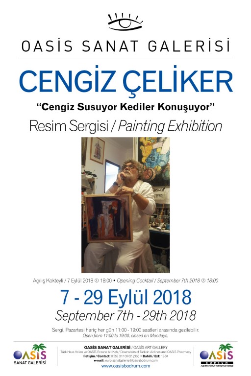 Oasis Sanat Galerisi’ne, ‘’Cengiz Susuyor Kediler Konuşuyor ’’ Resim Sergisi ile Cengiz Çeliker konuk oluyor. Sanatçı Cengiz Çeliker’in de katılım sağlayacağı sergi, 7 Eylül Cuma günü saat 18:00’de başlayacak kokteyl ile açılacak ve 29 Eylül 2018 tarihine kadar, pazartesi hariç her gün 11.00 -19.00 saatleri arasında ziyaret edilebilecek.