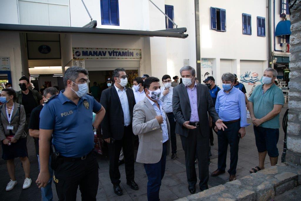 Bu kapsamda Bodrum Kaymakamı Bekir Yılmaz ile Bodrum Belediye Başkanı Ahmet Aras; Cevat Şakir Caddesi, Neyzen Tevfik Caddesi, Dr. Alim Bey Caddesi ve Cumhuriyet Caddesi’nde, başta yeme içme hizmeti veren işletmeler olmak üzere genel denetim gerçekleştirdi. İşletme sahiplerine koronavirüs salgını kapsamında alınması gereken önlemler ve uyulması gereken kurallar konusunda uyarılarda bulunuldu. Bazı işletmelerde masa mesafeleri ölçülerek, girişlerde zorunlu olan ateş ölçer ve maske kullanımı kontrol edildi.