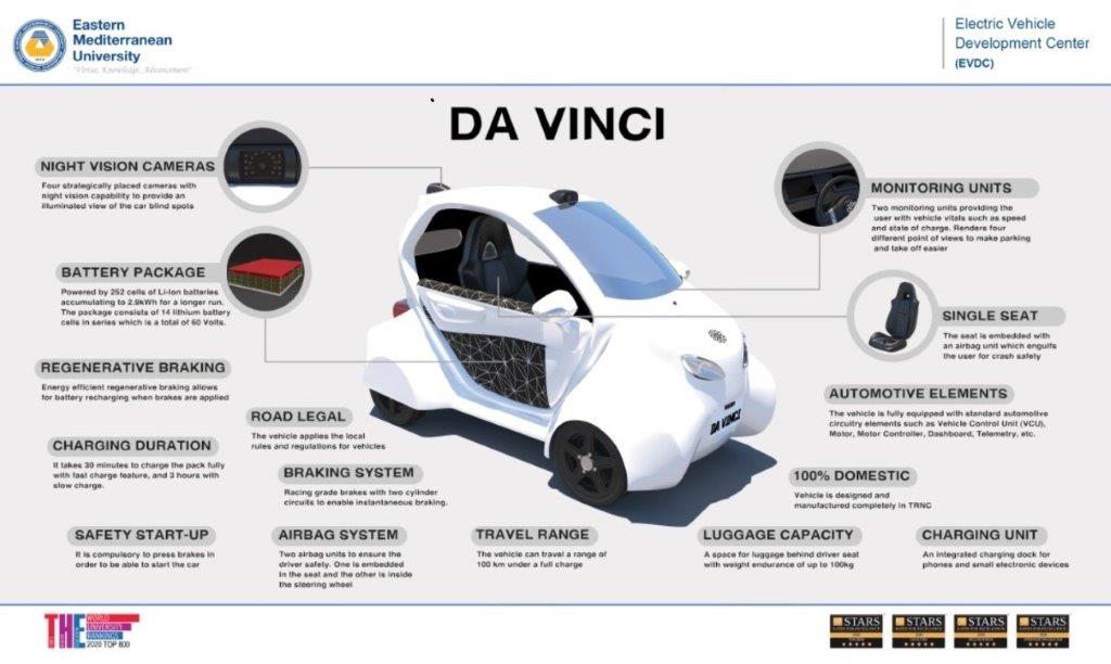 Tasarımı ve üretimi tamamen yerli olan ve Doğu Akdeniz Üniversitesi (DAÜ) Rektörlüğü’ne bağlı Elektrikli Araç Geliştirme Merkezi (EVDC) tarafından tasarlanıp üretilen “Da Vinci” isimli elektrikli araç tanıtıldı.