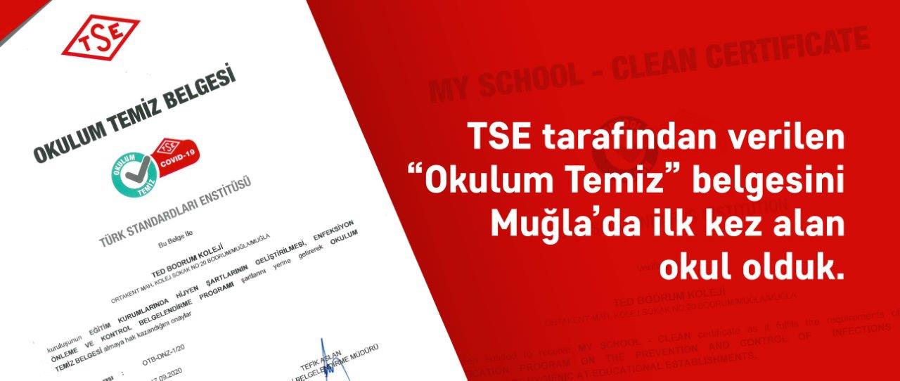 TED Bodrum Koleji, Türk Standarları Enstitüsü (TSE) tarafından gerçekleştirilen denetimler sonrasında ‘Okulum Temiz’ belgesi almaya hak kazanan Muğla’daki ilk eğitim kurumu oldu.