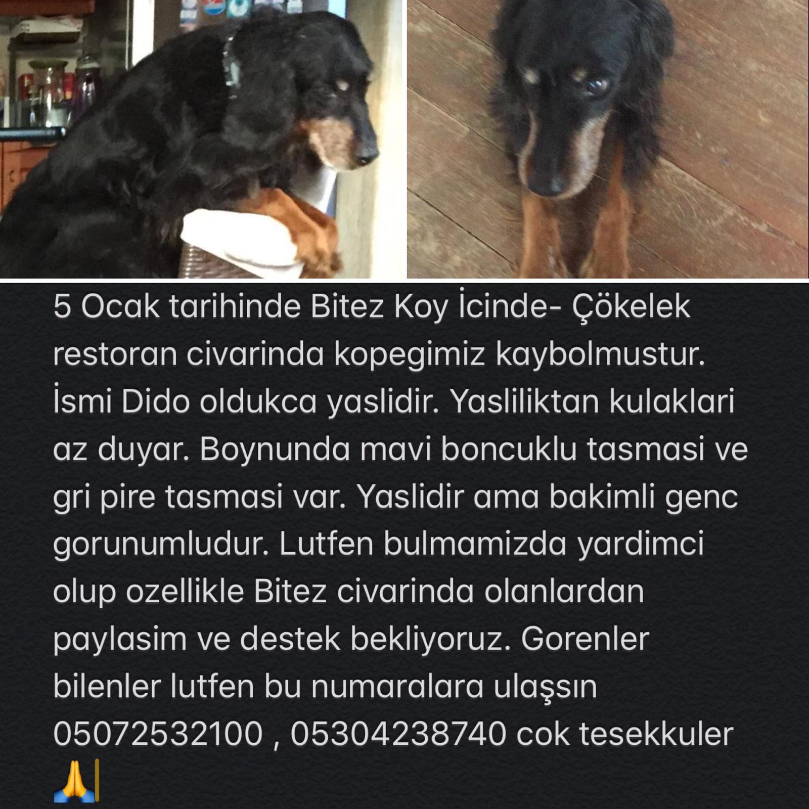 “Lütfen yayalım 🙏🏻 5 Ocak tarihinde Bodrum Bitez Köy İçinde Çökelek restoran civarında komiğimiz kaybolmuştur. İsmi Dido oldukça yaşlıdır. Yaşlılıktan kulakları az duyar. Boynunda mavi boncuklu tasması ve gri pire tasması var. Yaşlıdır ama bakımlı Genç Görünümlüdür. Lütfen Bulmamıza Yardımcı Olup Özellikle Bitez civarında olanlardan Paylaşım ve destek bekliyoruz.